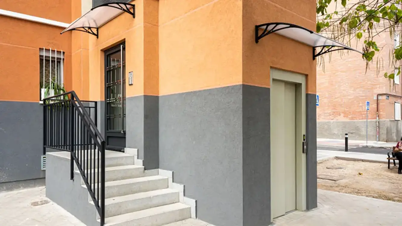 Ohne Platz im Treppenhaus oder Innenhof besteht noch die Möglichkeit, einen Aufzug an der Außenseite des Gebäudes anzubringen. Dabei müssen insbesondere die architektonischen Erfordernisse, Vorschriften zu Stadt- und Ortsbild und (falls erforderlich) die Zugangskontrolle und der Schutz vor Vandalismus berücksichtigt.