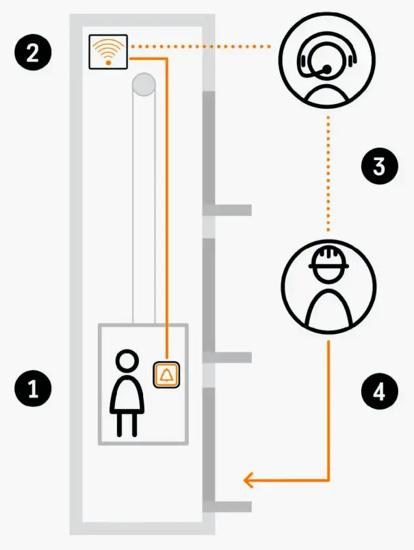 Les exploitants d’installations d'ascenseurs sont tenus de prendre des mesures de sauvetage en cas de défaillance impliquant une personne piégée. Un système d'appel d'urgence fiable apporte un soutien optimal dans de telles situations en établissant immédiatement une connexion avec le centre d'urgence ou de service.