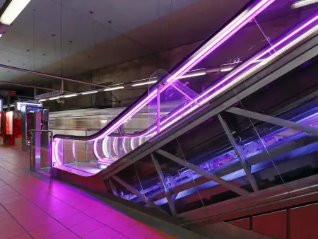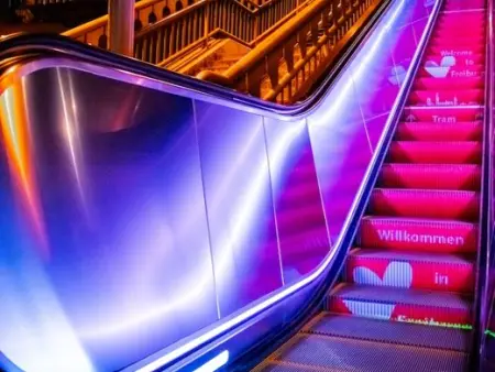 Die 2014 installierten 9 Fahrtreppen mit LED-Sockeln und Unterstufenbeleuchtung werten die Architektur des Gebäudes auf... Mehr