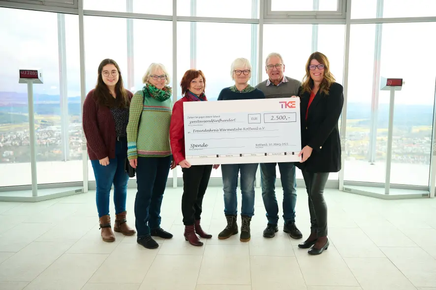 Rottweil, 10 March. 2023 - As manager of the TK Elevator test tower in Rottweil, Beate Höhnle today presented a cheque worth 2,500 euros to the Freundeskreis Wärmestube e.V. (Friends of the Wärmestube). The circle of friends runs the soup parlour, a facility that serves hot meals to people in need every day. Here, helpers of all ages are committed to providing comprehensive support to people in need.