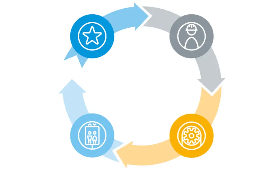 The company relies on the life cycle analysis of the individual components. Following that logic, the life cycle of an entire elevator is divided into four phases: