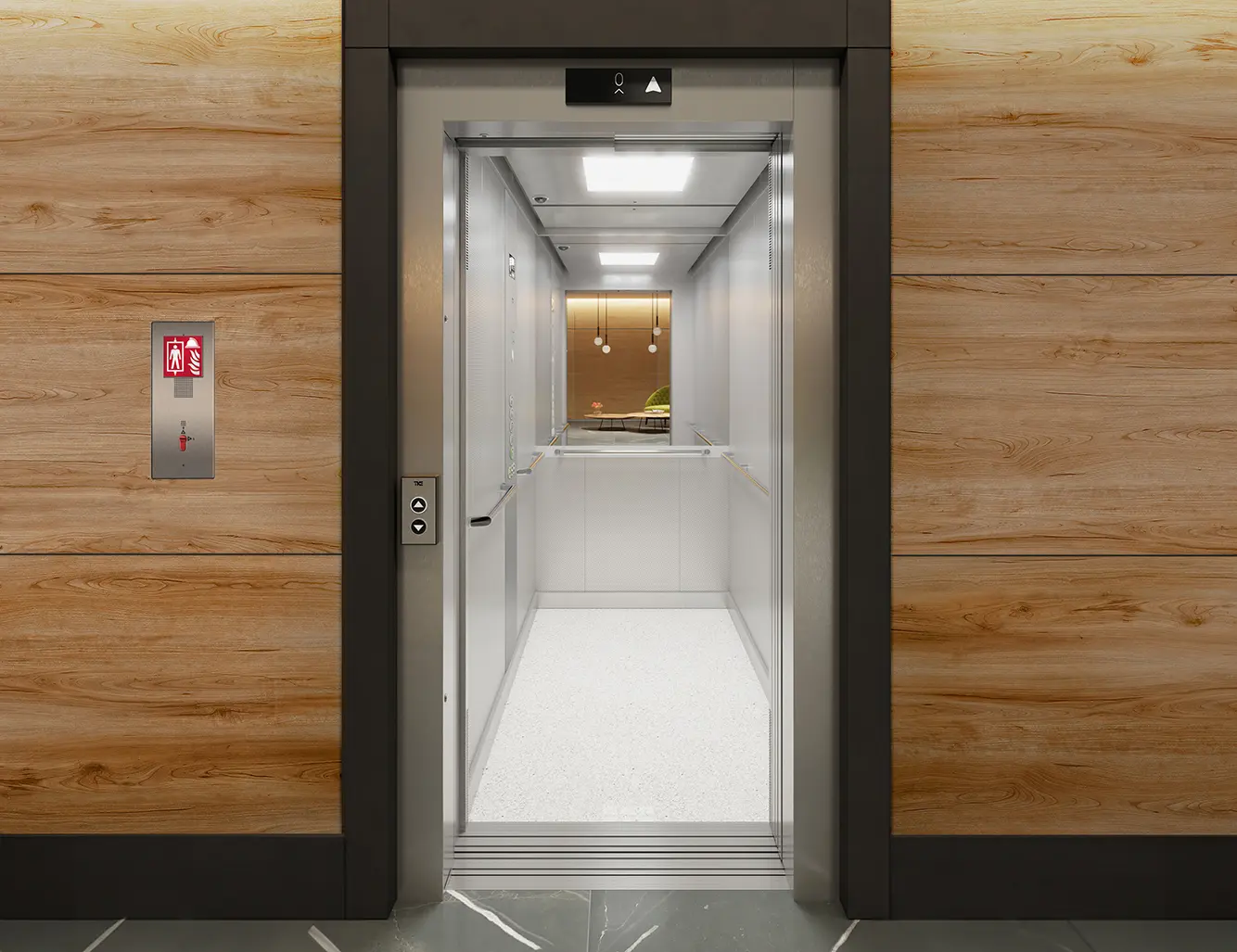 O teto da cabina inclui um alçapão de emergência de 700×500 mm com uma escada telescópica integrada, permitindo que os bombeiros saiam e entrem pela caixa do elevador.
